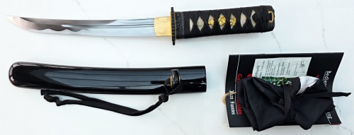Delivery includes: Wakizashi, Saya, cotton sword bag and certificate of authenticity.