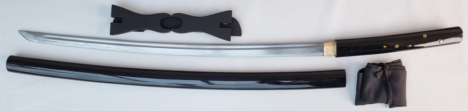 39" Overall with a 27" sharpened, clay tempered, hand forged, high carbon steel blade. Full tang blade with hardwood handle and saya with black lacquer finish. The tsuka features brass petal decor. Complete with storage sleeve, table stand and certificate