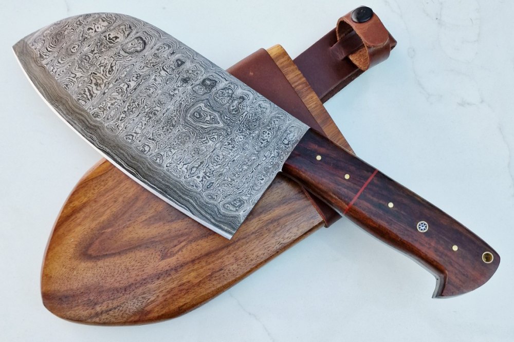13.5" Overall with a 8" hand forged, sharpened, high carbon steel blade, full tang with hardwood handles, Complete with wooden handle with belt loop