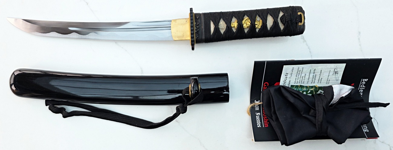 15.4" Overall with a 8.4" sharpened, hand forged high carbon steel blade, black cord ito and genuine rayskin, ba,boo pegged. blade features dual bohi, wooden saya with lacquer finish in black, complete with certificate and storage sleeve, from a respected brand, good quality