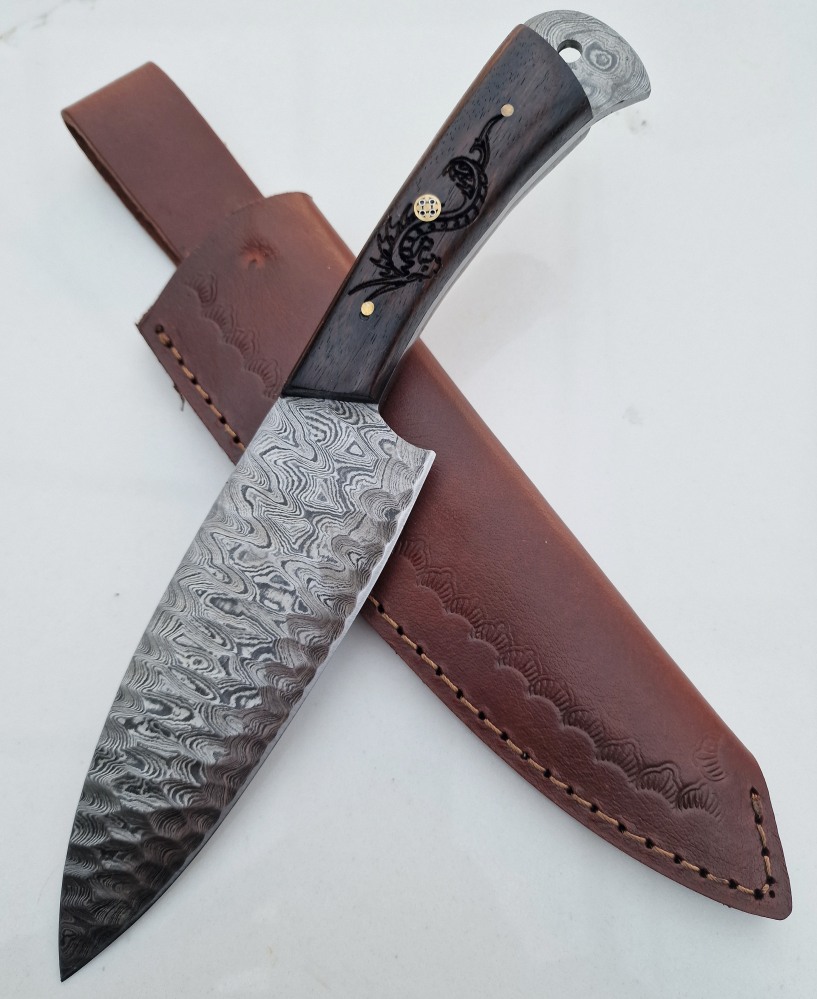 10.43" Overall with a 5.9" sharpened, hand forged, damascus steel blade, full tang with lanyard hole and wooden handle scales with hand carved dragon, complete with leather belt sheath