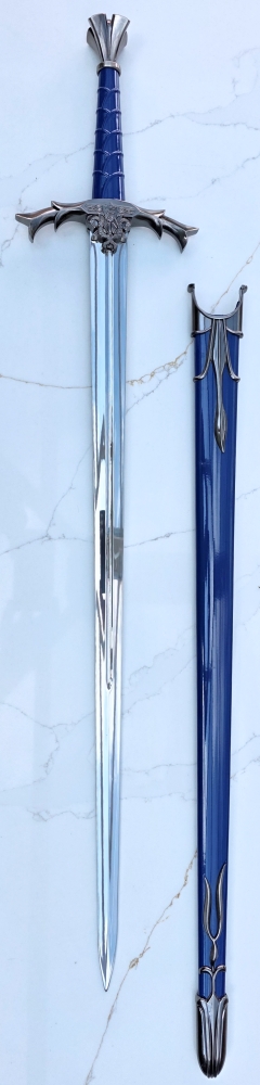 38.5" Overall with a 29.5" unsharpened, stainless blade, cast metal fittings in a pewter finish and blue ABS handle and scabbard with metal fittings. Well finished item